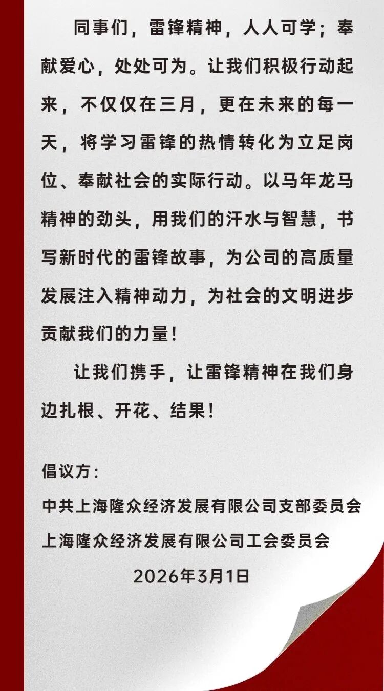 2026年3月2日,正值全国“学雷锋月”之际,上海隆众经济发展有限公司于上午在大会议室隆重召开学雷锋主题活动动员大会。本次大会标志着本年度学雷锋系列活动正式拉开帷幕,全体干部职工齐聚一堂,共同宣誓将雷锋精神融入岗位、践行于日常。