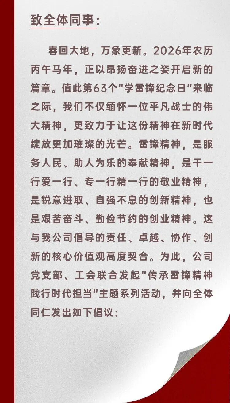 今年是第63个“学雷锋纪念日”。在新时代背景下,雷锋精神早已超越时空,成为爱岗敬业、无私奉献、助人为乐的永恒坐标。公司积极响应号召,以“弘扬雷锋精神,凝聚发展动能”为主题,推动员工从“身边小事”做起,让奉献成为习惯,让担当成为自觉。