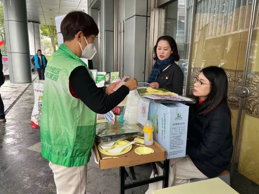 活动现场,隆众经济党支部的志愿者们化身“环保宣传员”,向过往居民和楼宇职工科普聚乳酸(PLA)生物环保材料的特性、应用场景及环保优势。从可降解餐盒到环保包装制品,志愿者们通过实物展示、现场讲解的方式,让大家直观了解到绿色材料在日常生活中的广泛应用,以及对减少白色污染、守护生态环境的重要意义。
